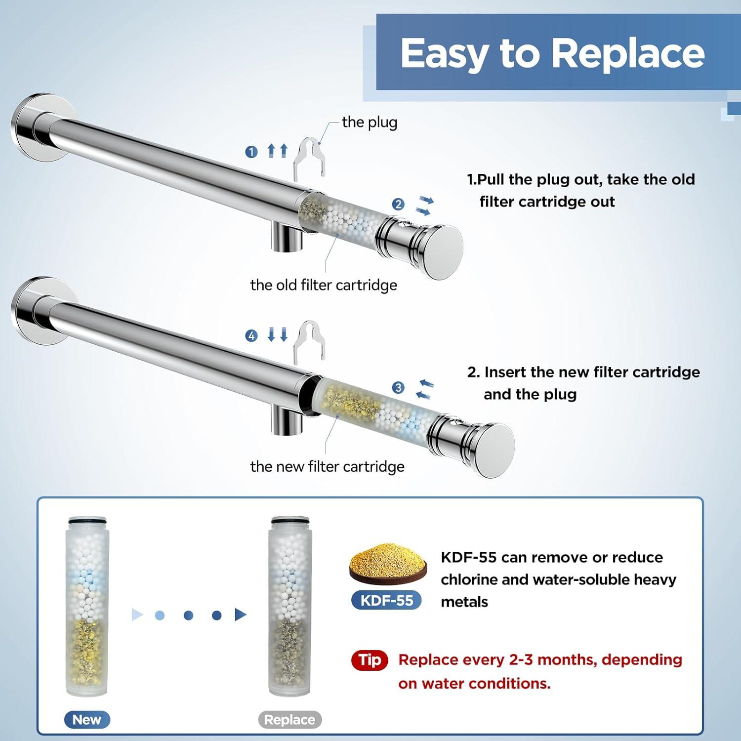 READY IN SECONDS: Our universal shower arm can quickly connects to any standard shower head for clean shower experience in less than a minute. You just pull the plug out first, take out the used shower filter cartridge and put in a new one, no special skill or tools required. The shower filter cartridge is usually replaced within 2-3 months, depending on your water quality and usage.