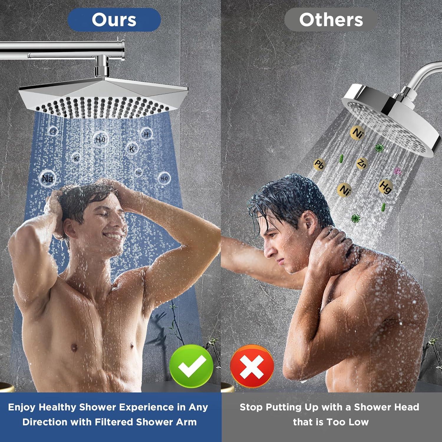 STAINLESS STEEL MATERIAL: This upgrade shower pipe is made of high-quality stainless steel with a high polished chrome finish that ensure durability, no leak-proof. This Filtered shower arm can keep the shower head in a horizontal position all the way, doesn't tilt like regular straight shower arms, allowing you to enjoy full-body rainfall shower experience.